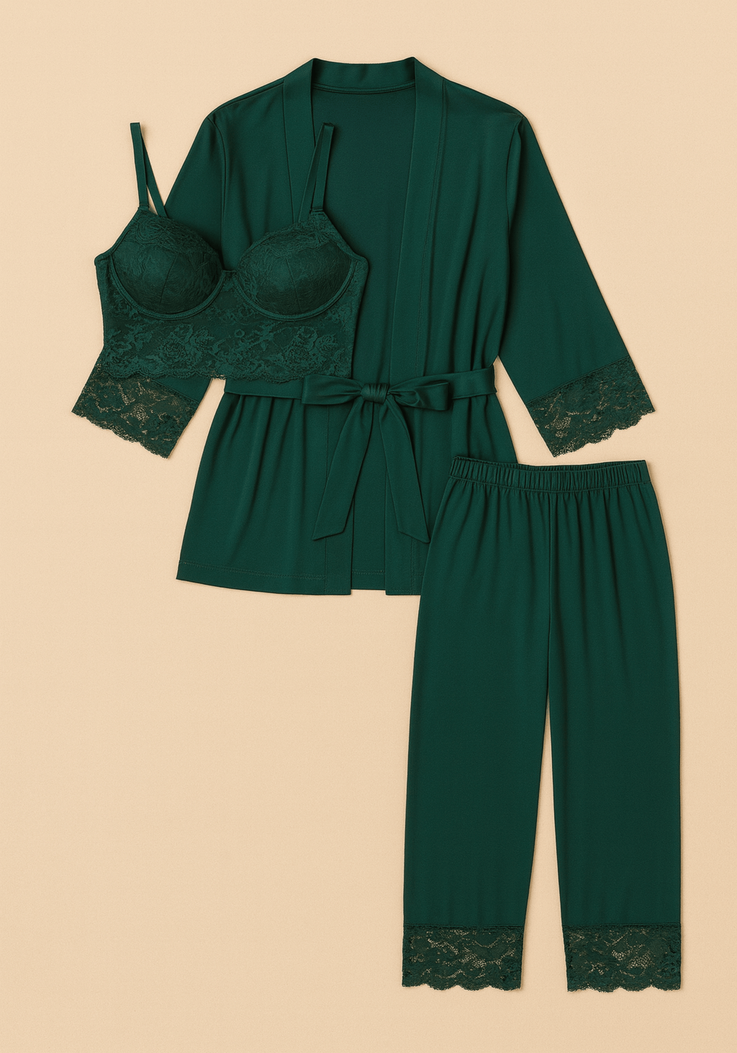 Modal 3 Piece Set: Padded Underwire Shoulder Strap Lace Bustier And Pants And Robe With Lace Details
