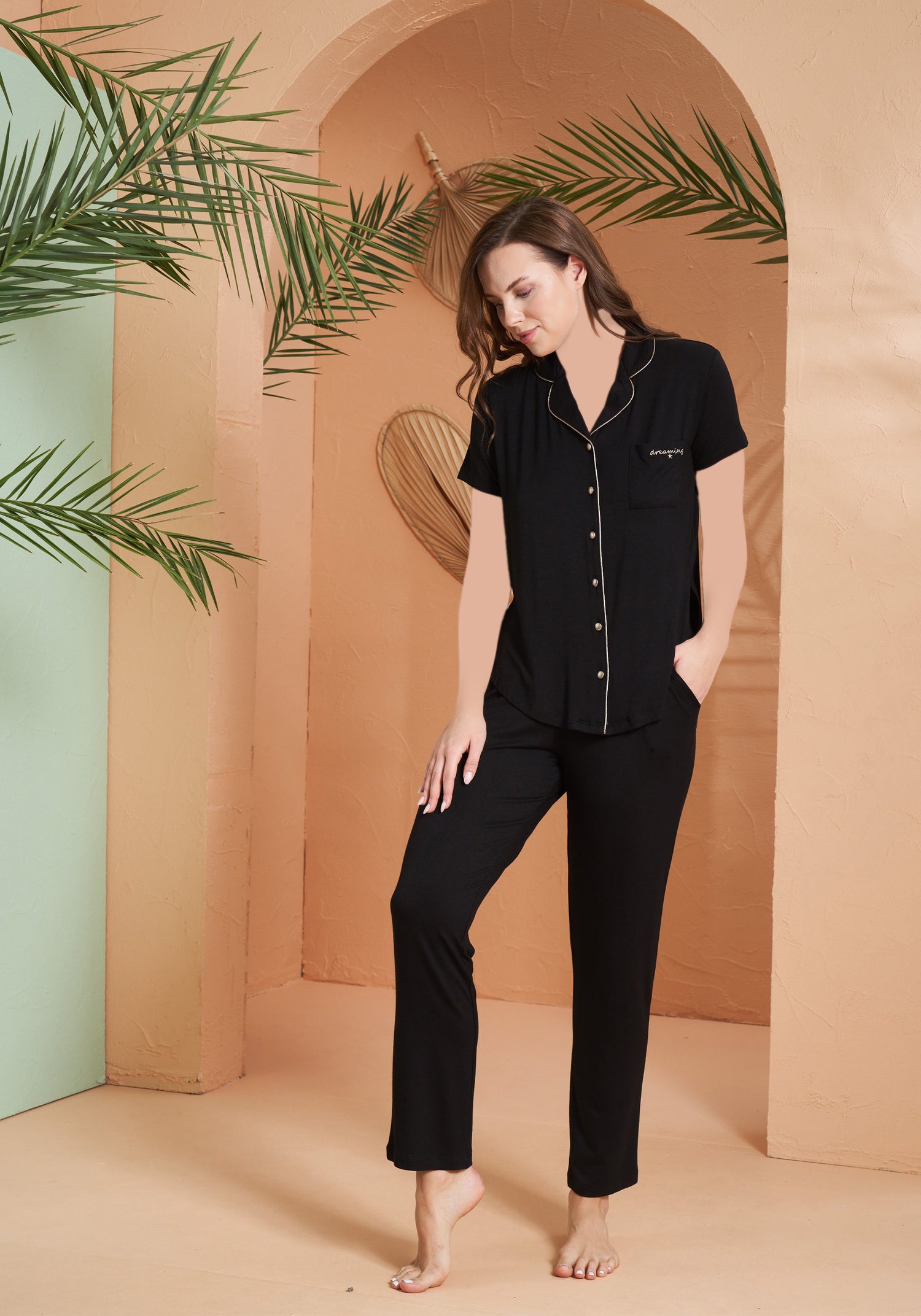 طقم بلوزة وبنطلون بأكمام قصيرة وياقة وأزرار من الفيسكوز والليكرا
