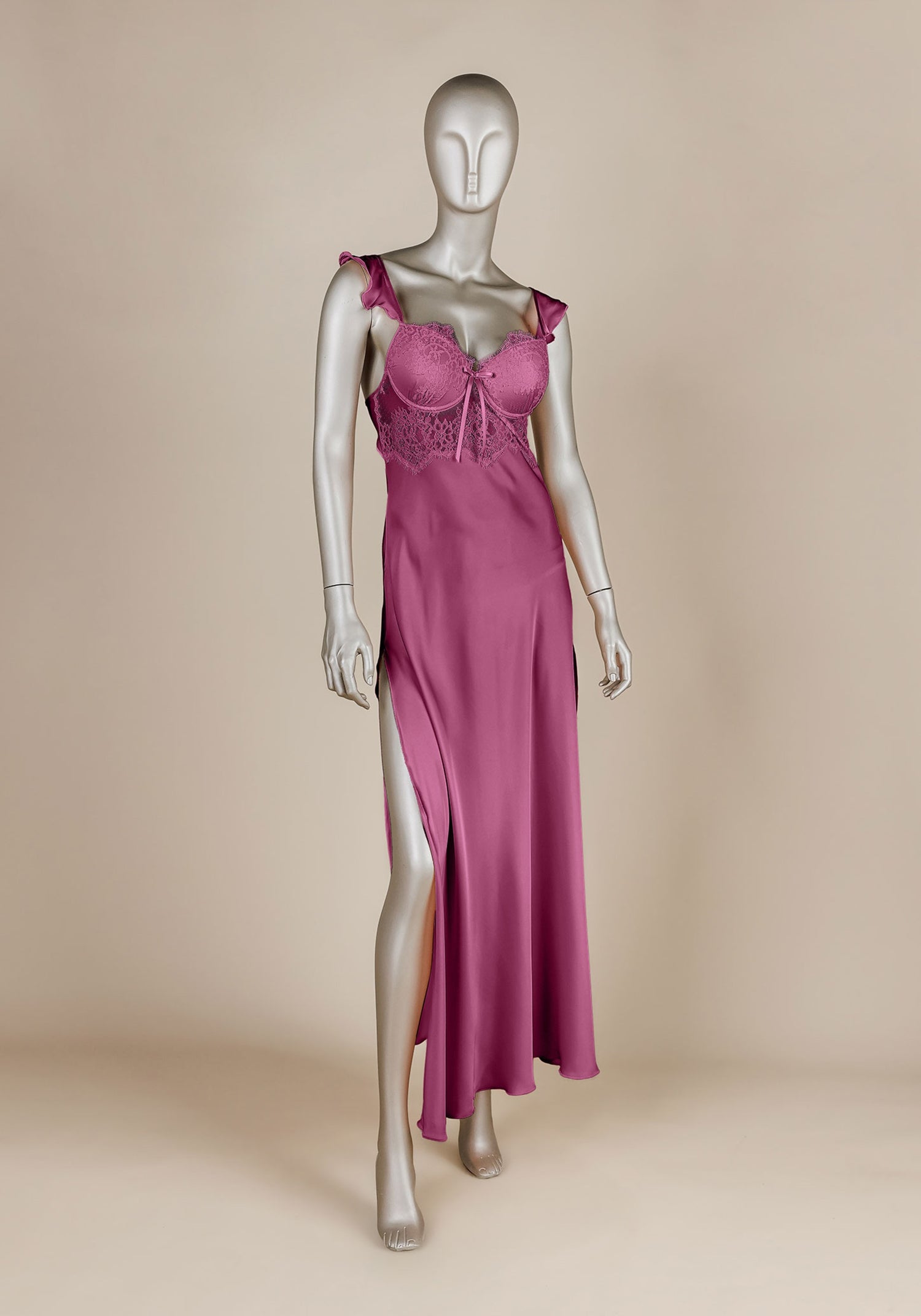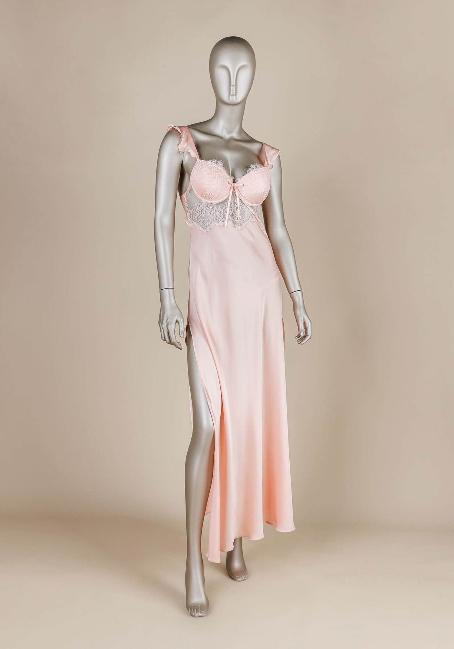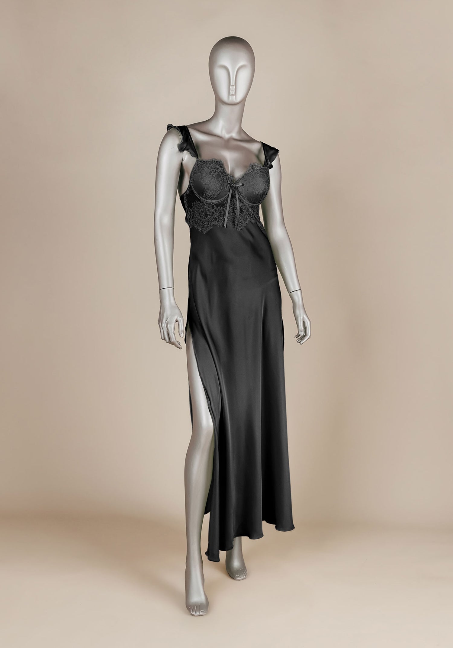 فستان طويل من الساتان: حمالة صدر مبطنة بسلك سفلي، قميص نوم طويل من الساتان بفتحة جانبية