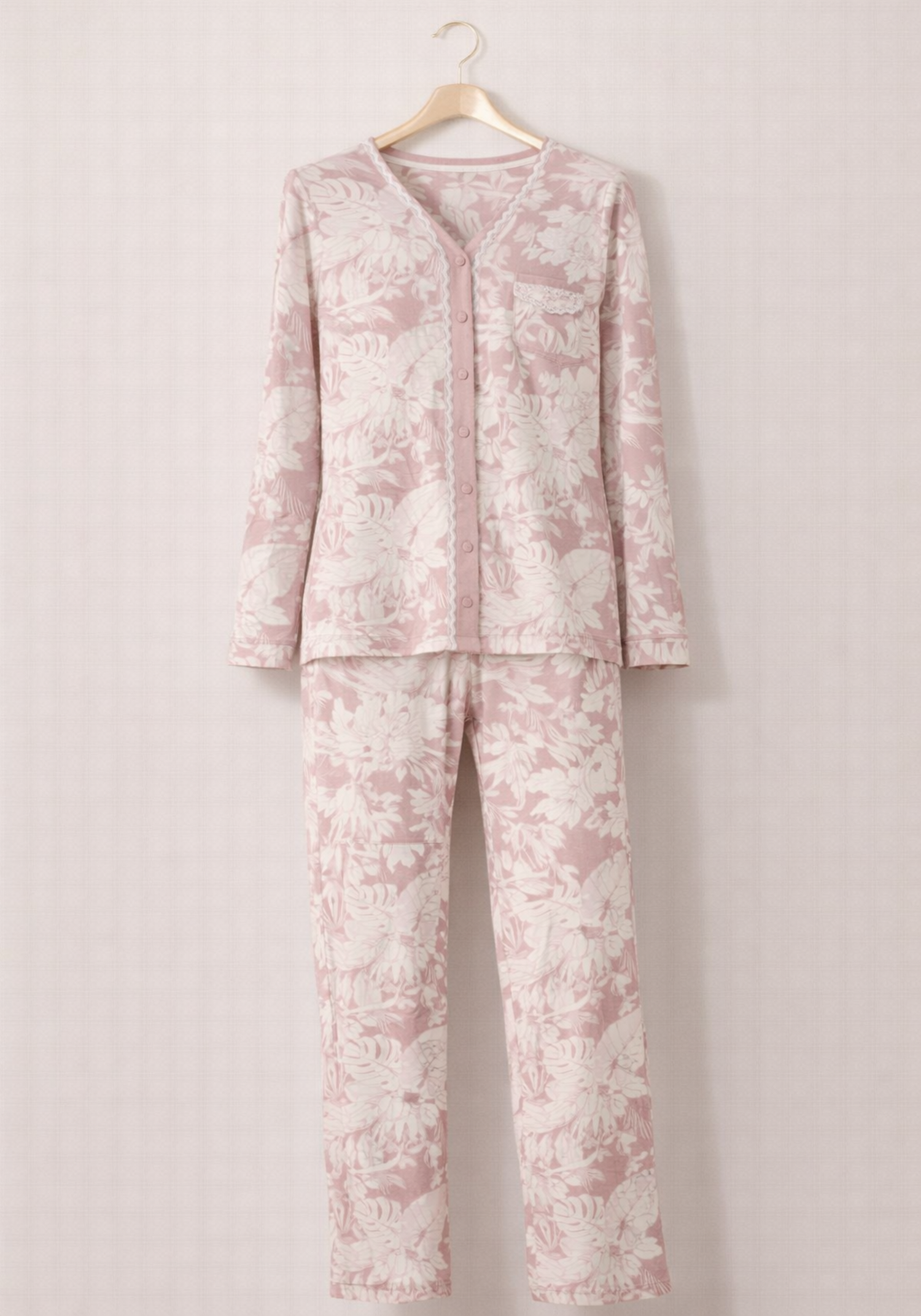 Button Long Sleeve Pajamas With Lace Detail (Vis Els)