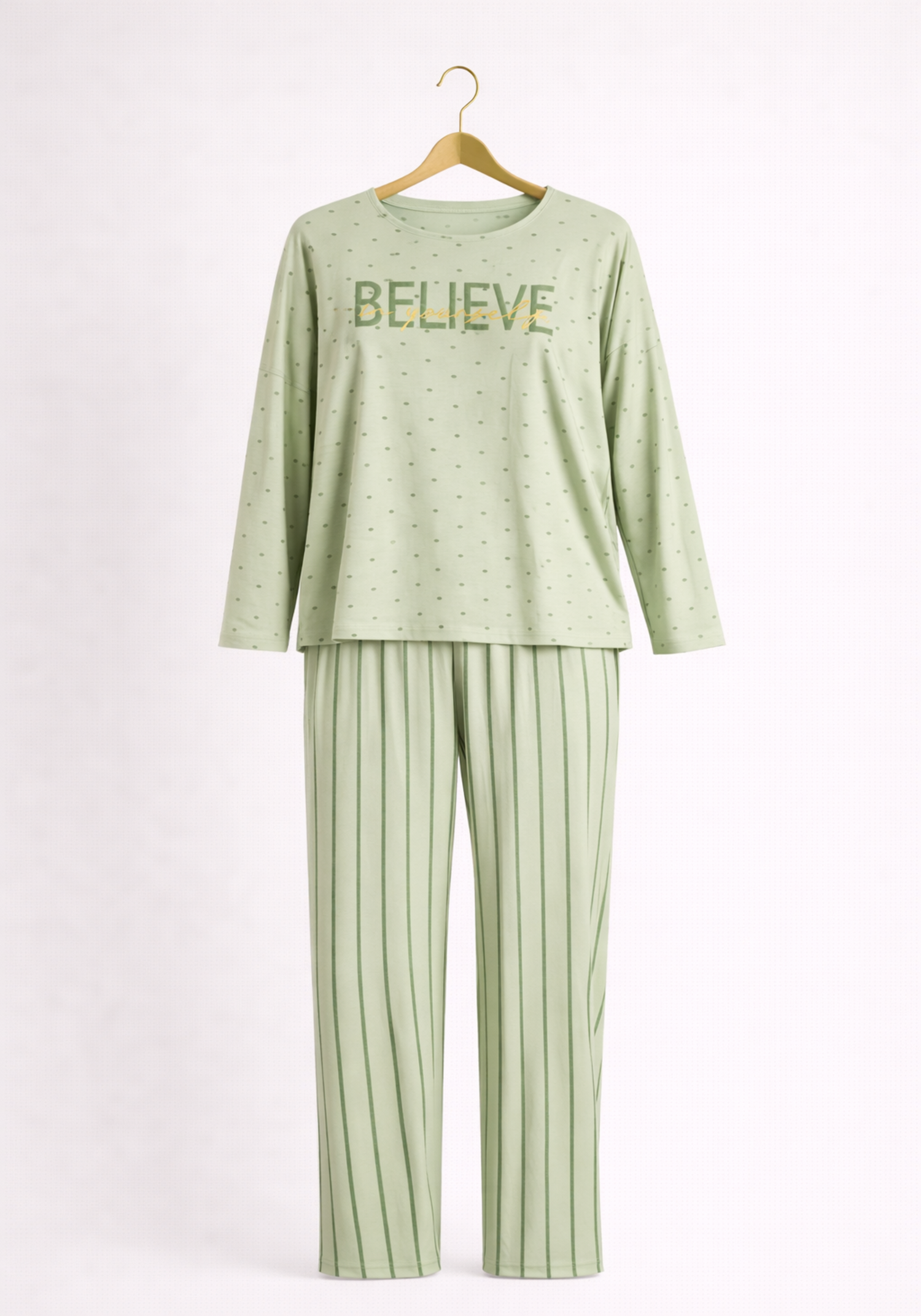Round Neck Long Sleeve Pajamas: Dotted Top And Striped Pants (Vis Pes Els)