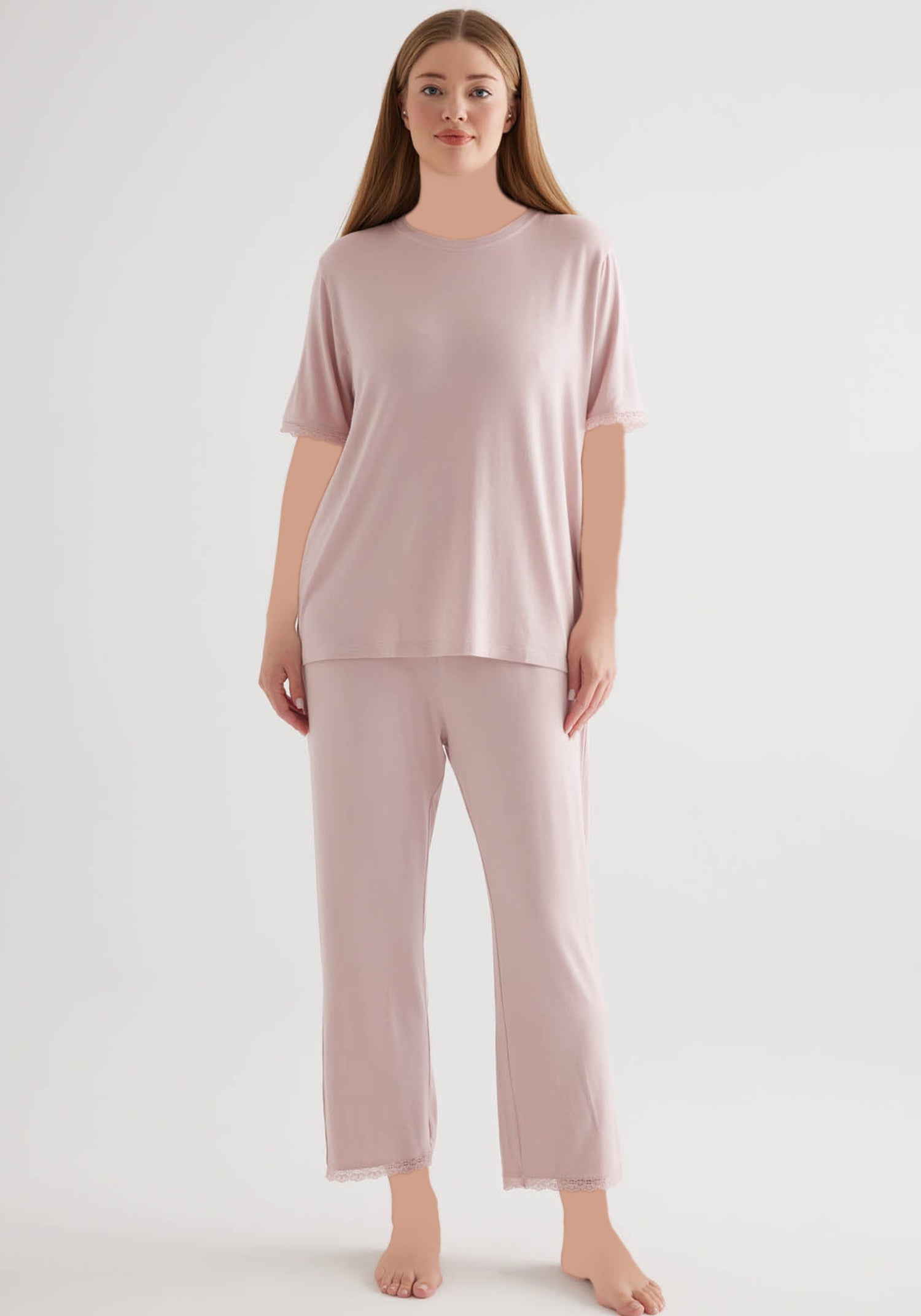 طقم بلوزة بأكمام قصيرة وبنطال طويل من فيسكوز لايكرا بمقاس كبير