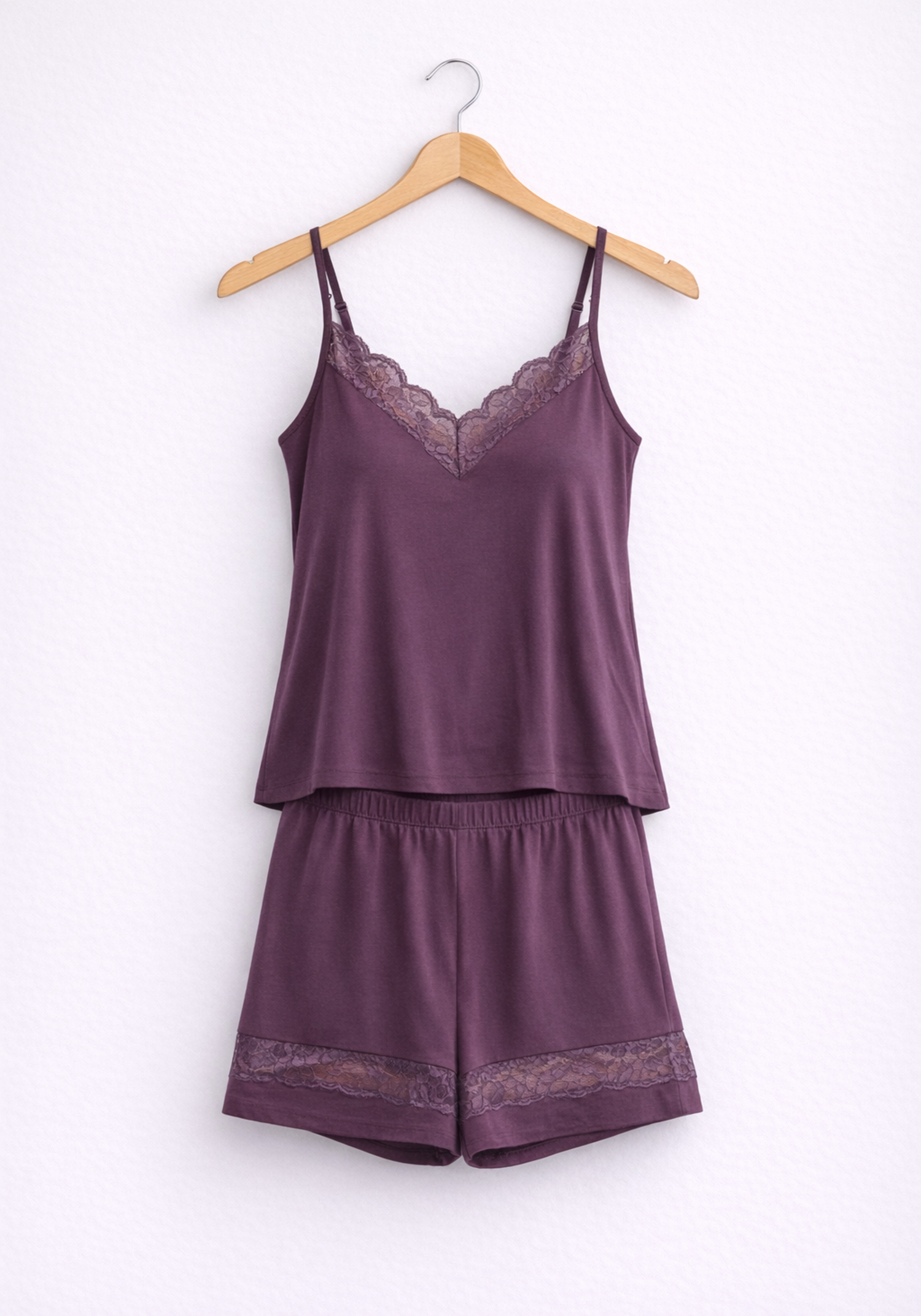 Cotton Shoulder Strap Top And Short Set With Lace Detail